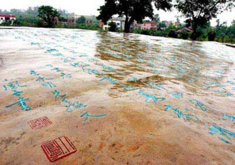據(jù)書(shū)寫(xiě)該賦的我市知名書(shū)法家、本報(bào)編輯張弢介紹,當(dāng)時(shí)把這賦轉(zhuǎn)移到巨石上頗費(fèi)了些周折,“是書(shū)法與現(xiàn)代科技的結(jié)合!”書(shū)寫(xiě)后先掃描到電腦里放大,然后制作出一張500多平方米的大紙,鋪在巨石上。接著,將字體部分挖空,用刷特制漆涂在上面,最后風(fēng)干后揭開(kāi)紙,于是,巨大的文字便成功“印”在了巨石上。這項(xiàng)工程動(dòng)用了20名工匠,耗時(shí)整整兩個(gè)月才完成!